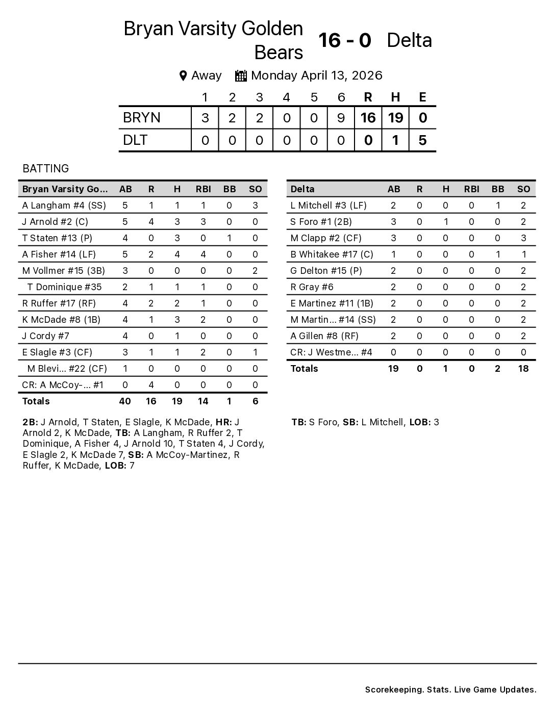 Bryan JV rolls past Delta 22-4, powered by the bottom of the lineup. Grime, Telles, and Myers combined for 4 hits, 7 runs, and 5 RBIs.