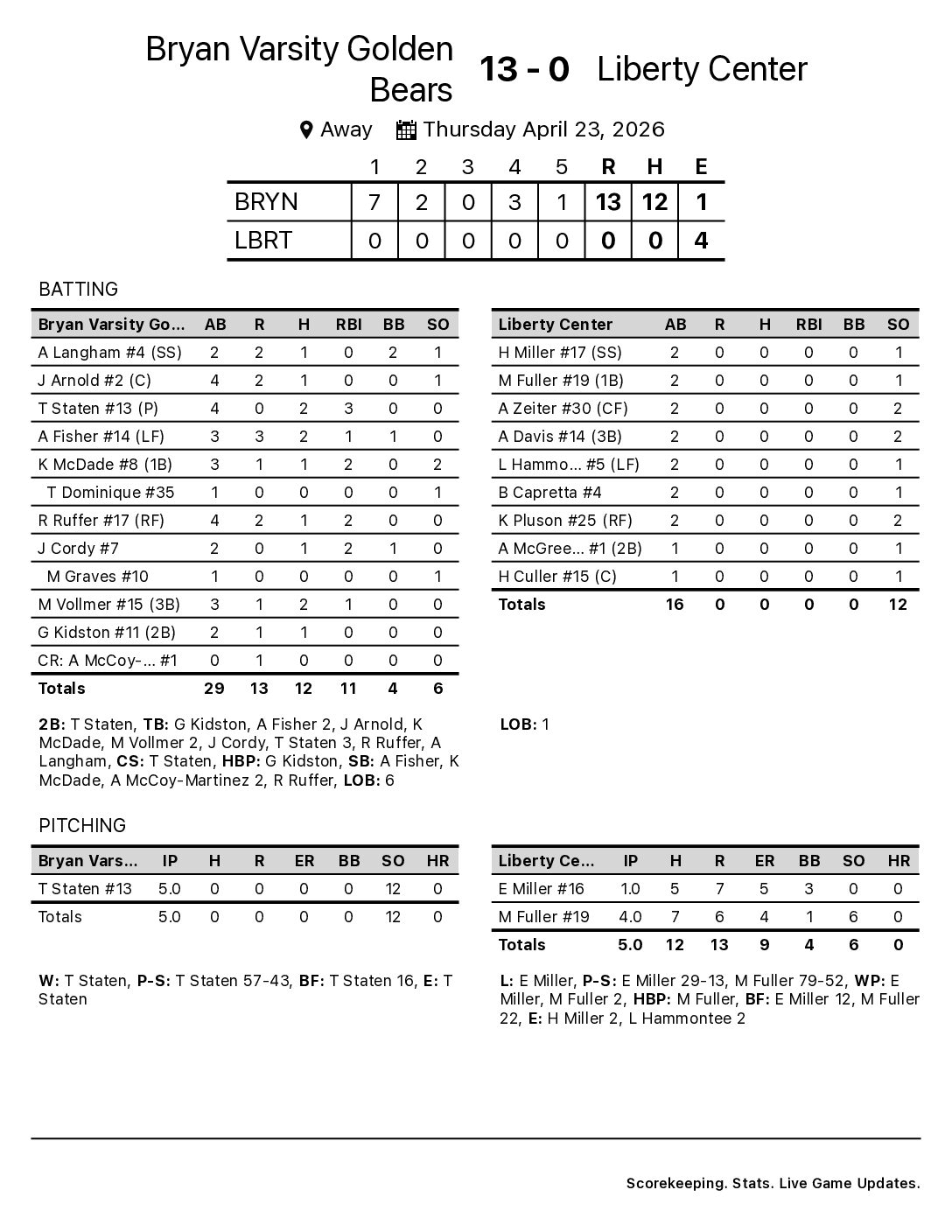 Cam Bukowski was dominant on the hill, as the righty rang up 12 strikeouts in Bryan Varsity Golden Bears’s 5-3 victory over Liberty Center Varsity Tigers on Thursday. Bukowski allowed five hits and three runs over six innings while walking four.